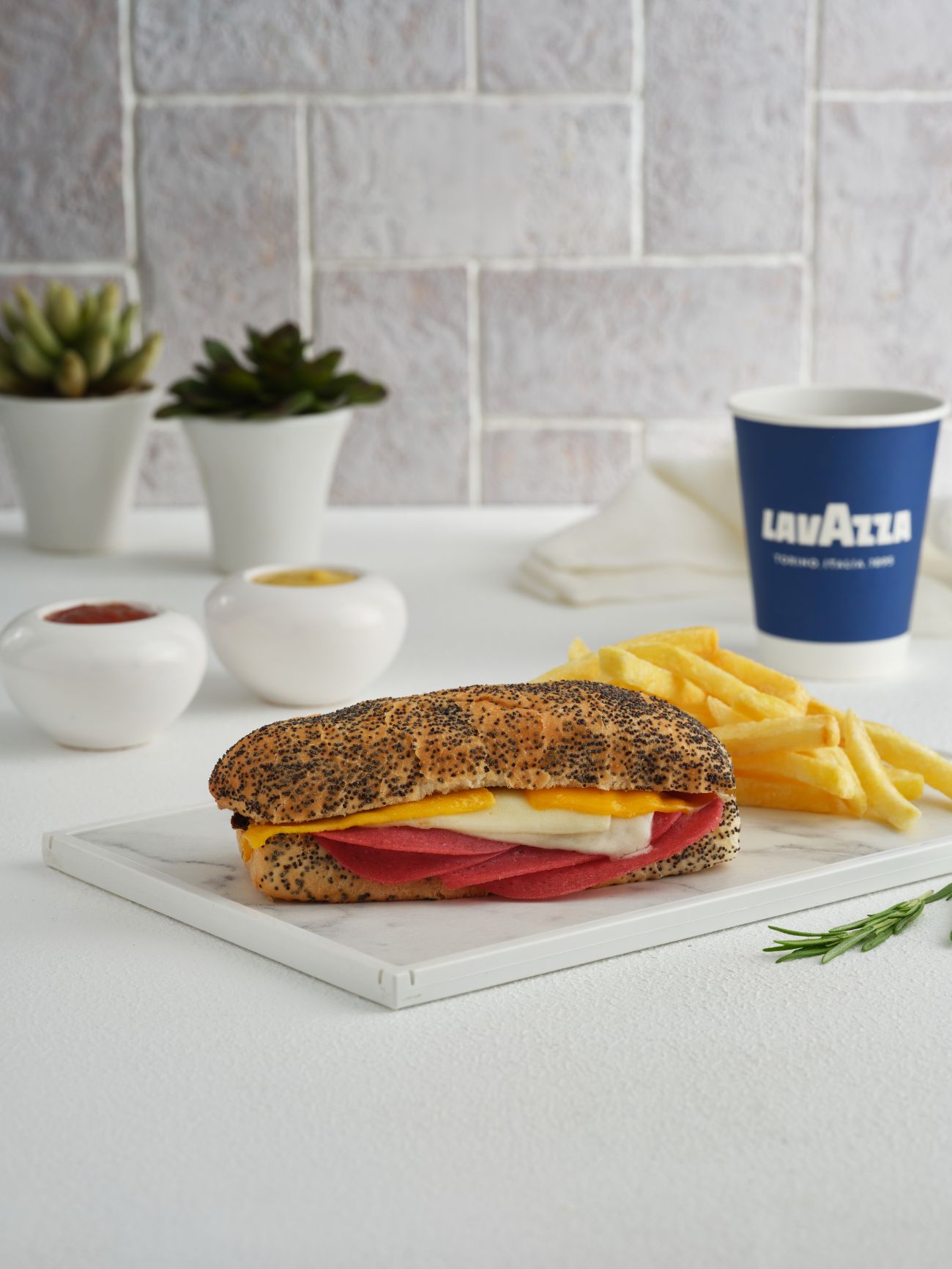 Haşhaşlı panini ekmeği, Dana jambon, Çedar peyniri, Kaşar peyniri, Kuru domates, Hardal.