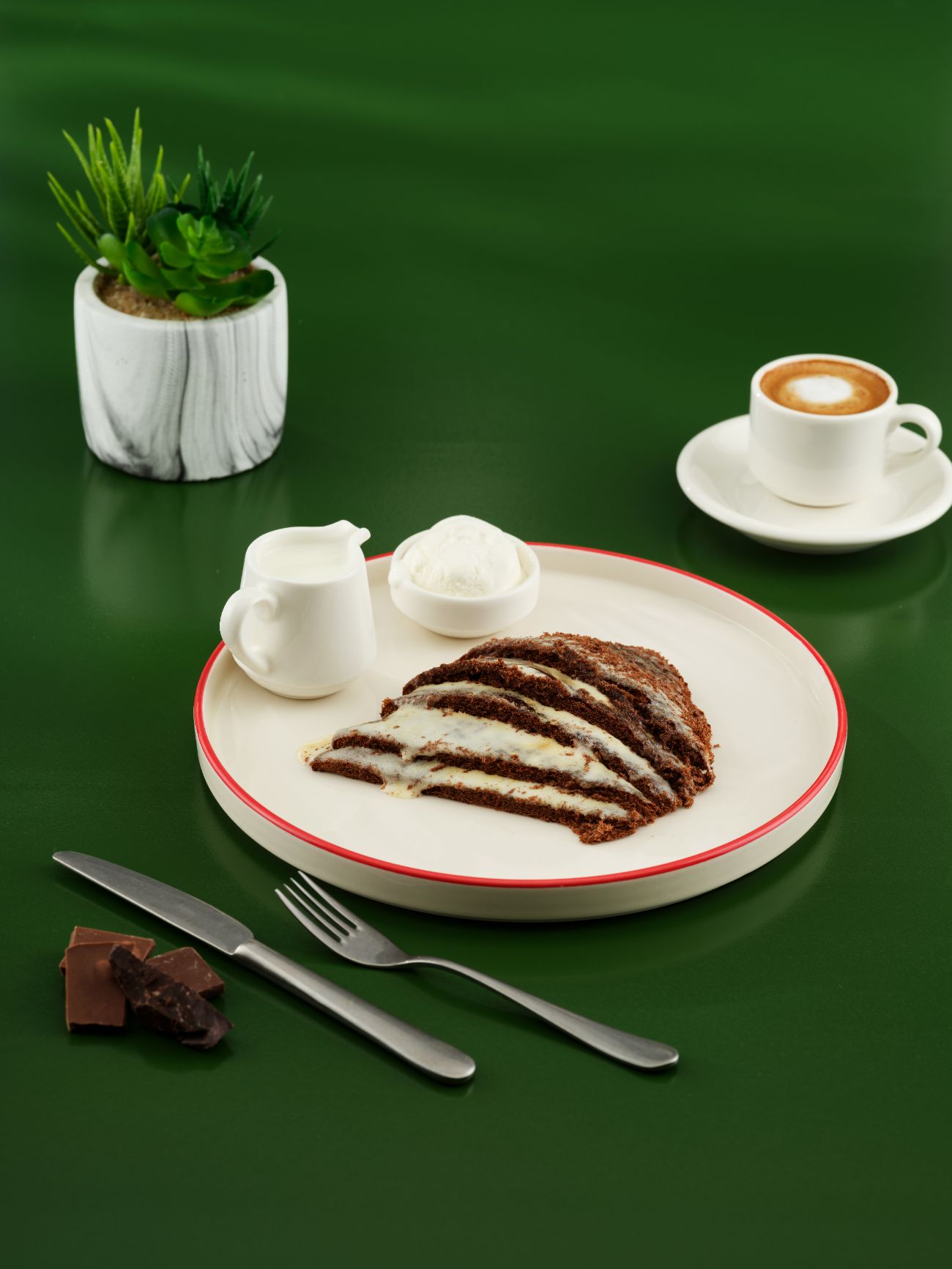 Orjinal Çek tatlısı olan marlenka sıcak sunumu yanında süt ve dondurma ile